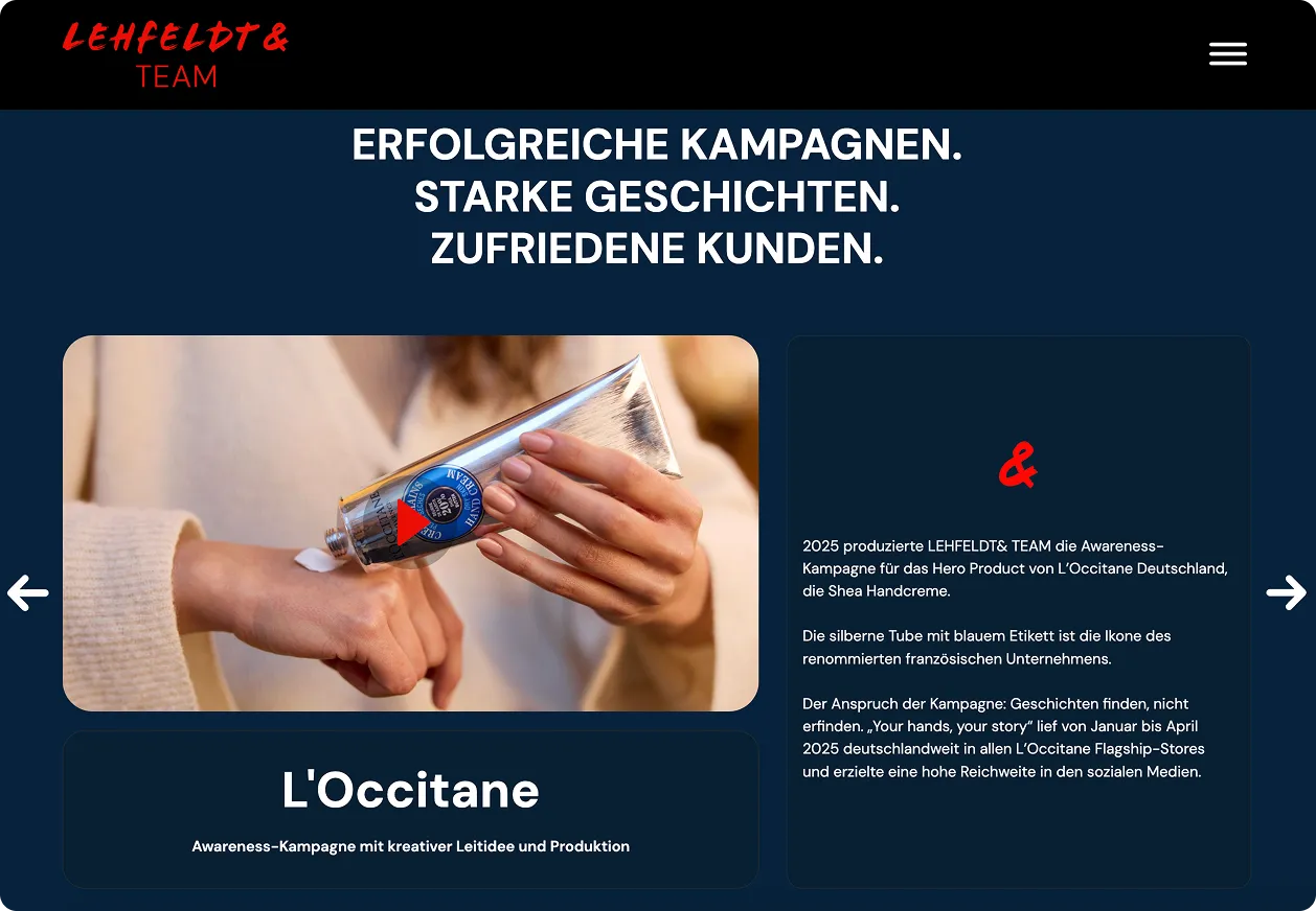Eine erfolgreiche Migration: LEHFELDT& verfügt nun Webseite die nach 2026 aussieht und die Boutique Agentur sowie Ihre geleistete Arbeiten hochprofessionell darstellt.