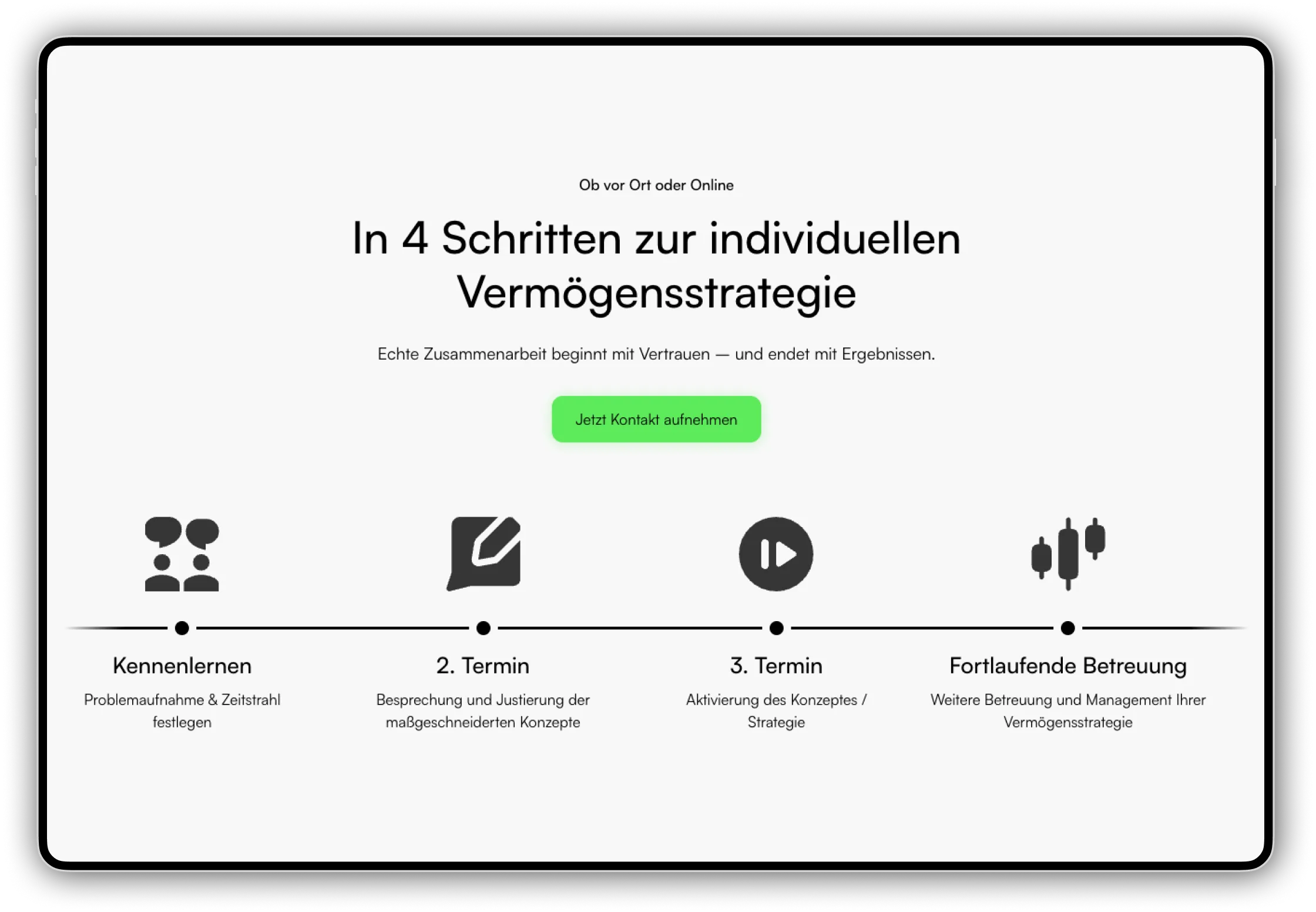 Die Prüfer Vermögensmanagement GmbH verfügt nun über eine moderne, professionelle Website, die nicht nur die regulatorischen Anforderungen (Compliance) vollständig erfüllt, sondern auch als überzeugendes Beratungs-Tool dient. Das neue, hochwertige Branding schafft sofortige Glaubwürdigkeit und hebt das Unternehmen klar von seinen Mitbewerbern ab. Die intuitive Nutzerführung und die fokussierte Darstellung der Kompetenzen stärken die Positionierung als vertrauenswürdiger und kompetenter Partner in der Vermögensverwaltung und unterstützen das Unternehmen maßgeblich bei der Neukundengewinnung.