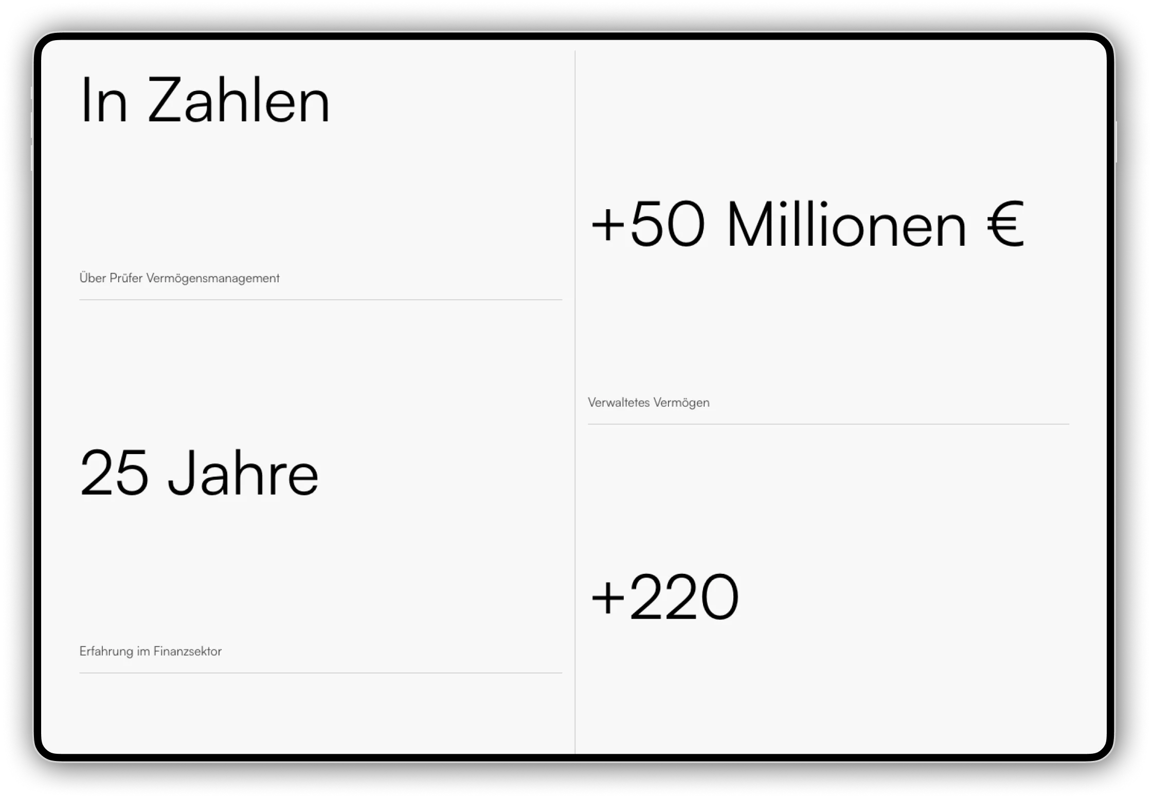 Die Prüfer Vermögensmanagement GmbH bietet produktunabhängige Finanzdienstleistungen an. Die größte Herausforderung war die Schaffung einer digitalen Präsenz, die den hohen Anforderungen der Finanz-Compliance gerecht wird und gleichzeitig Vertrauen, Seriosität und Modernität ausstrahlt. Es war notwendig, eine Plattform zu schaffen, die Kompetenz in Kombination mit einprägsamen Branding unmissverständlich kommuniziert.